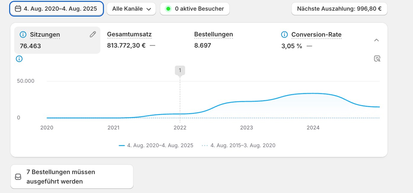 Das Wichtigste aber: Ich habe Trinkabenteuer komplett alleine aufgesetzt und es lief extrem stabil und hat nie versagt. In der Zeit von 3 Jahren habe ich dort 813.772,30 € Sales mit 8697 Bestellungen generiert.