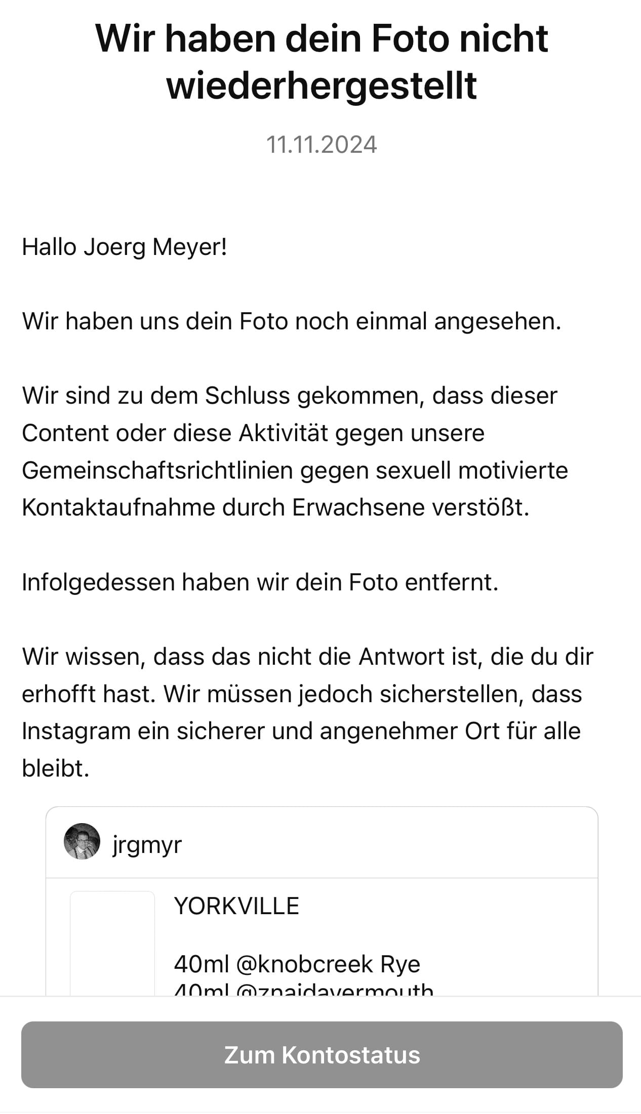 Erst heute wurde ein Drinks-Bild von Dennis Stein, was mein Account als Collab Partner geteilt hat, als „Sexuell motivierte Kontaktaufnahme durch Erwachsene“ eingestuft. Meine Beschwerde mit der Bitte um Prüfung wurde abgelehnt, das Bild eingeschränkt. Das ist natürlich dumm und falsch. Aber man muss sich nicht vor der Realität verschließen, das Regulierungsbehörden hier die Verantwortung an die Konzerne abgeben, und diese die Arbeite möglichst kostengünstig bewältigt sehen wollen.