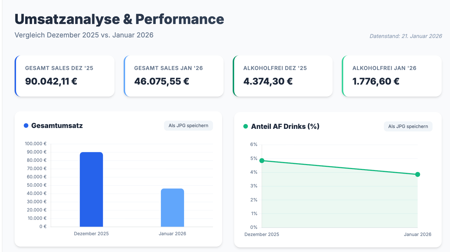 Im Januar bin ich aktuell fast jeden Abend selber in der Bar. Und die Zahlen stimmen mit meiner Wahrnehmung überein. Die Leute haben Lust auszugehen. Und zu trinken. Alkoholisch. 865 Basil Smash im Januar lügen nicht.